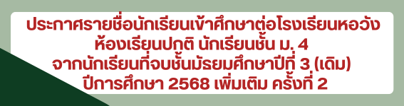 ประกาศรายชื่อนักเรียนและคะแนนที่ผ่านการคัดเลือกเข้าศึกษาต่อชั้นมัธยมศึกษาปีที่ 4 ปีการศึกษา 2568 เพิ่มเติมครั้งที่ 2 |